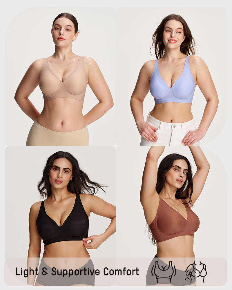 The deep V seamless design shapes and gathers without squeezing. Smooth under clothing, pressure-free on skin, it creates a natural, flattering bust line you’ll love in every outfit.